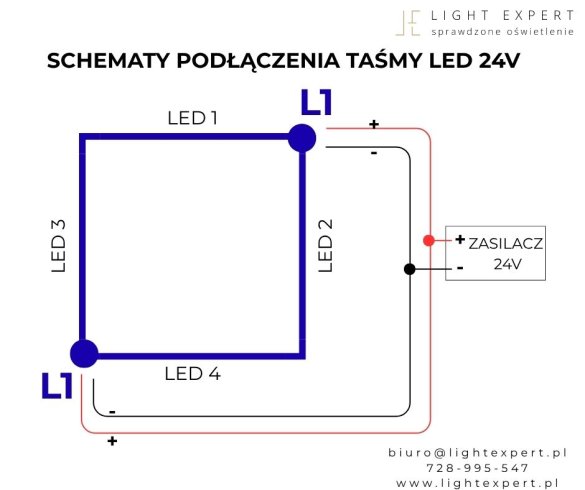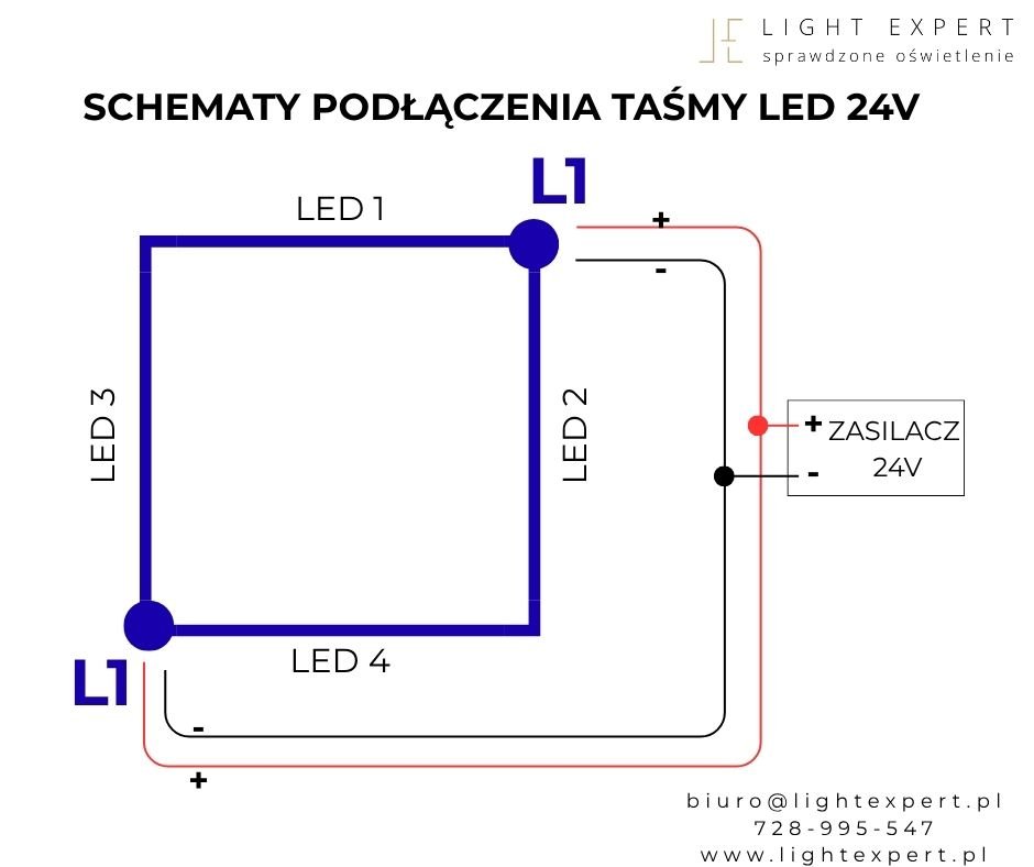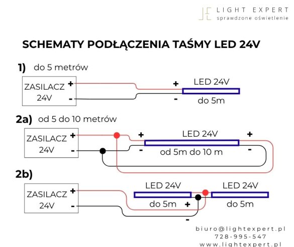Podłączenie taśm LED w kilku punktach zasilania to prosty sposób na poprawienie wydajności i estetyki całego oświetlenia, zapewniając równomierne i intensywne światło w całej instalacji.