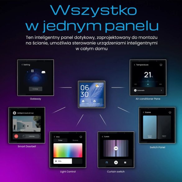 - Możliwość tworzenia scen i automatyzacji, które są wykonywane przez panel w zależności od warunków lub harmonogramu