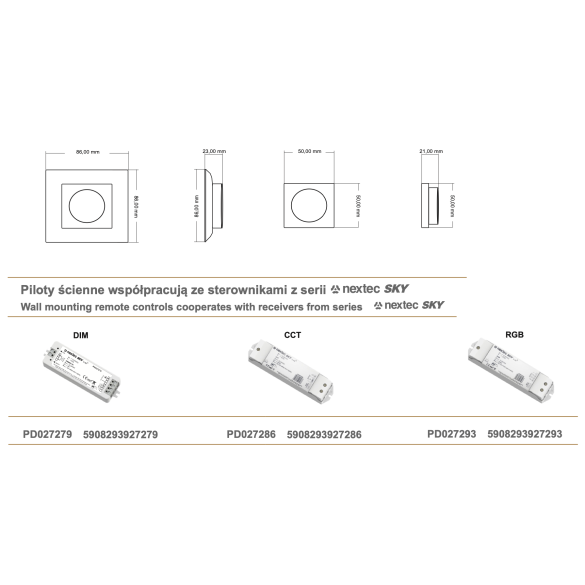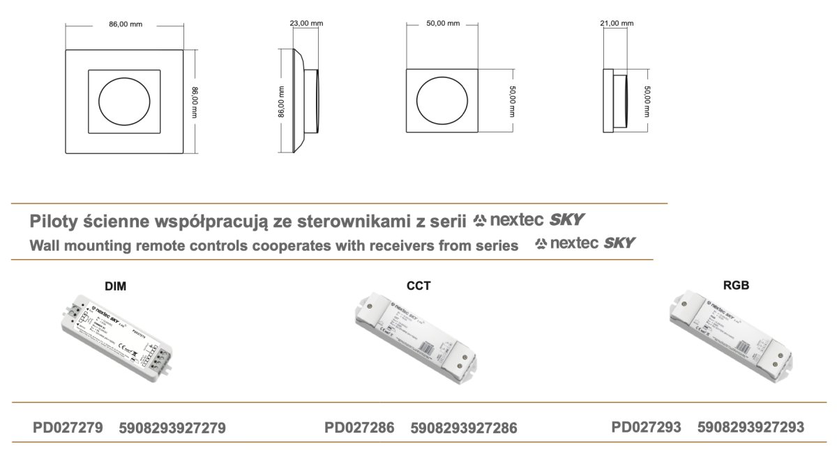 - - Wymiary panelu: 86 x 86 x 23 mm