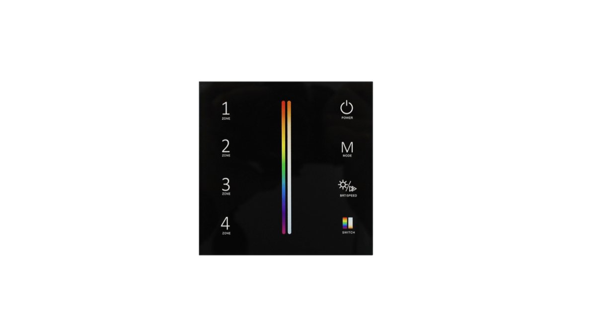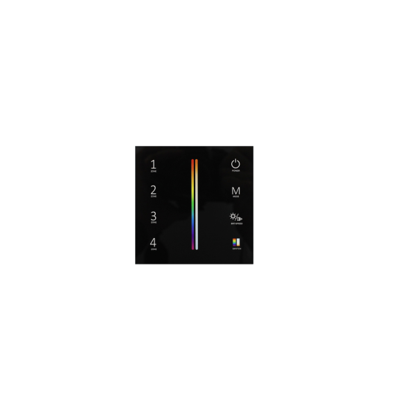Profesjonalny sterownik LED w formie dotykowego panelu ściennego, przeznaczony do sterowania oświetleniem RGB+CCT w systemie SKY. Urządzenie umożliwia niezależną kontrolę do 4 stref oświetlenia oraz wygodne zarządzanie zarówno kolorem RGB, jak i temperaturą barwową światła białego. To rozbudowany kontroler LED do nowoczesnych instalacji, w których istotne są niezawodna komunikacja radiowa 2.4GHz, estetyka montażu oraz intuicyjna obsługa wielu funkcji z poziomu jednego panelu.